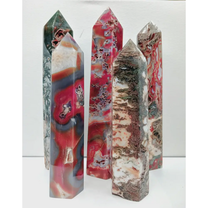 Experience the stunning beauty and vibrant energy of these Red Moss Agate Towers, each standing an impressive 7.5" to 9.5" tall! These towers feature gorgeous depth, rich red hues, and sparkling gemy inclusions—each piece is a true work of natural art. Red moss agate is cherished for its connection to nature, grounding power, and ability to inspire growth and vitality, making these towers a showstopping addition to your altar, meditation space, or home décor.